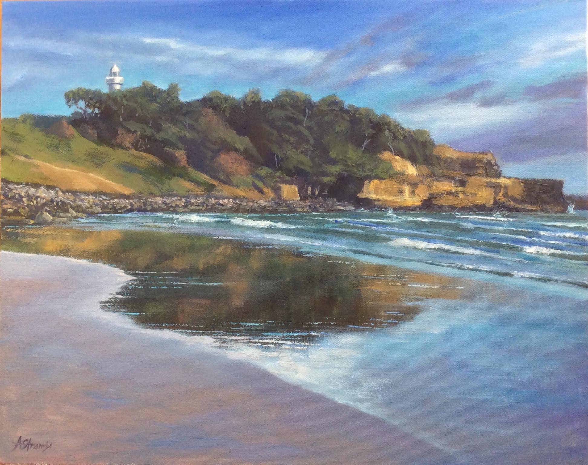 This original oil painting was inspired by the reflections in the wet sand beneath the Yamba Headland. There is a glimpse of the iconic Yamba lighthouse above the trees on the headland. This is one of my favourite views! The artwork is on stretched canvas and is framed in a pine frame and ready to hang.
