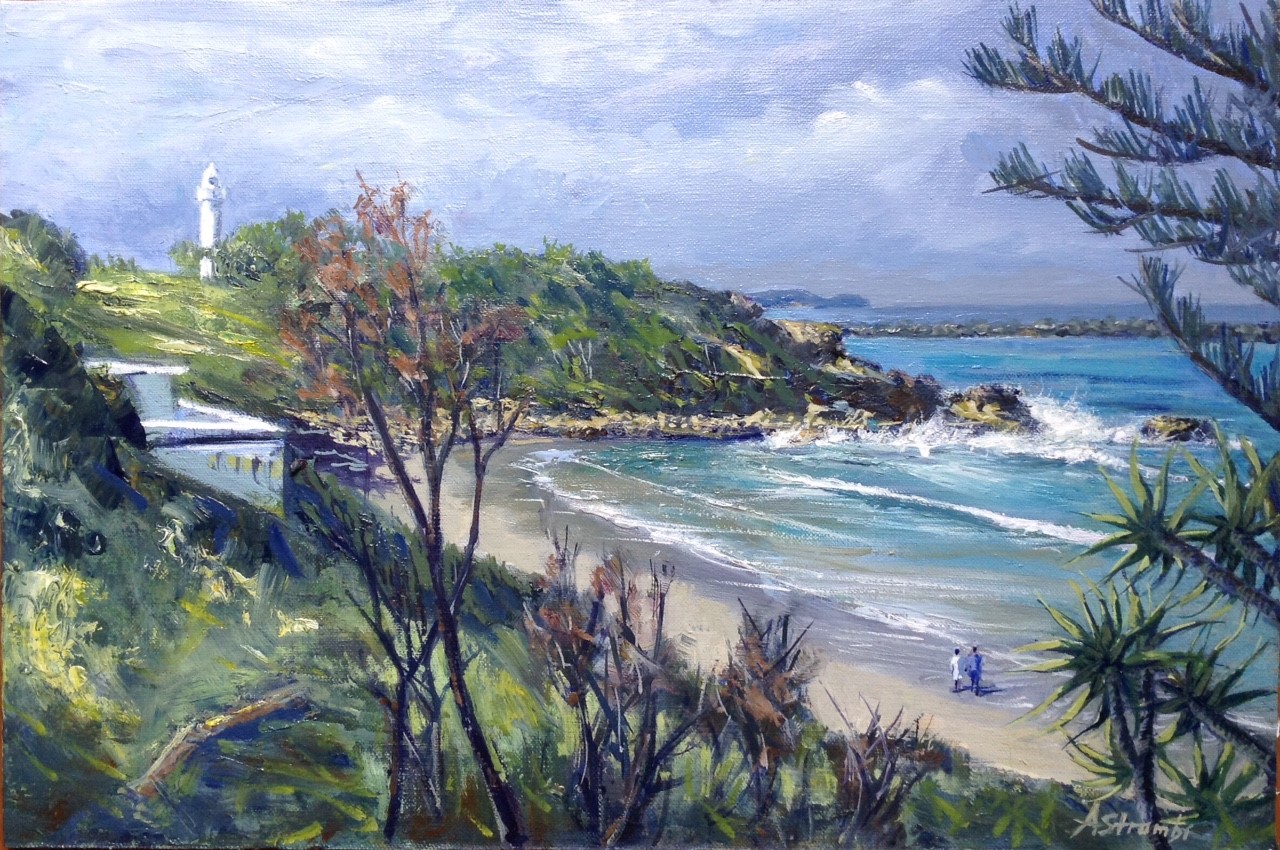 Yamba View by Anne Strambi – This original oil painting was inspired by the view of the headland with the lighthouse standing watch at Main Beach, Yamba, NSW. Now that I live in Yamba, I find so much inspiration in the many beautiful beaches. This painting is framed and ready to hang. The frame measures 50 cm x 35 cm.