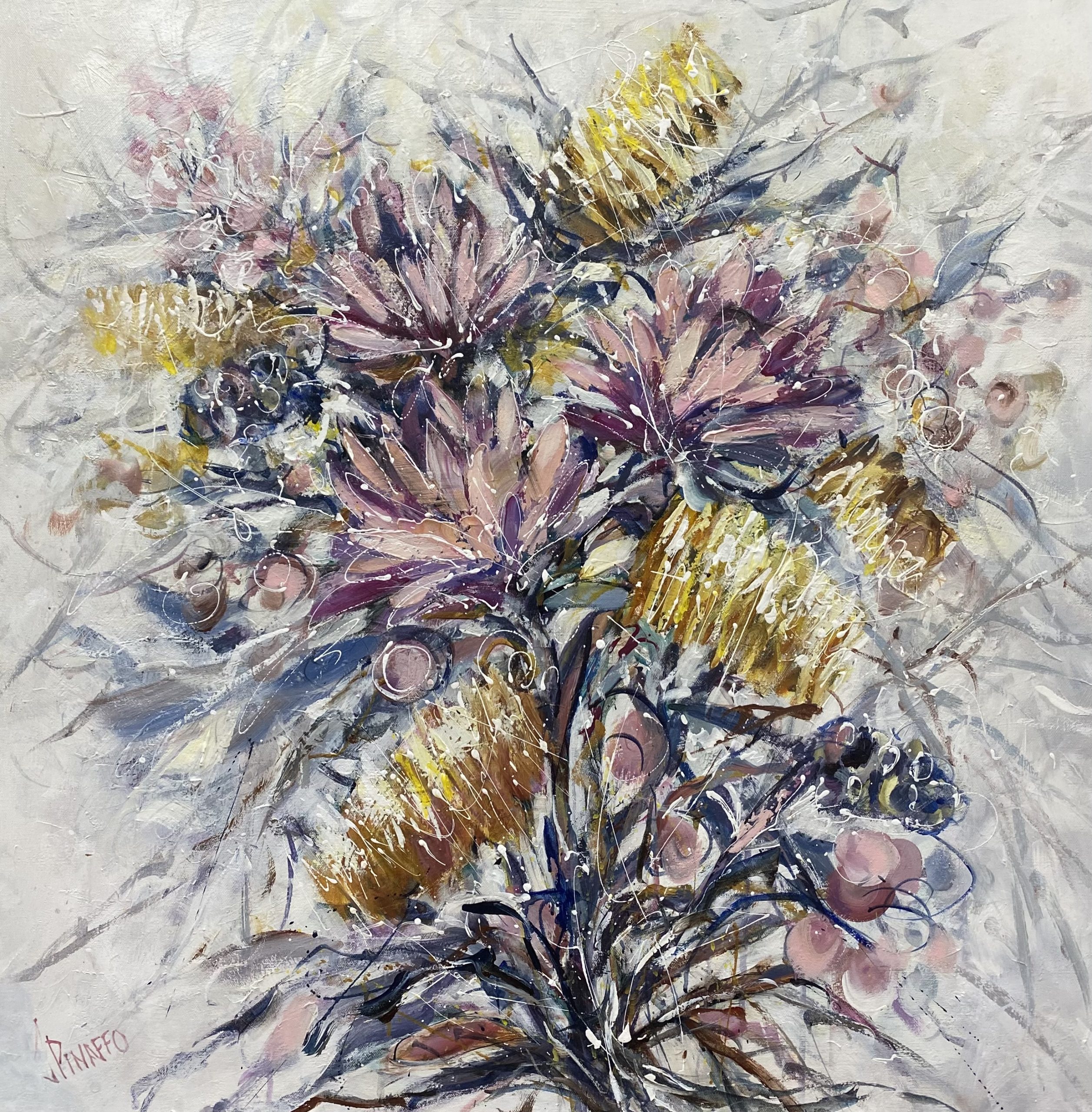 I create as I go with shapes, colours and texture. I loved creating this painting and I hope that it will bring joy on someone’ wall.