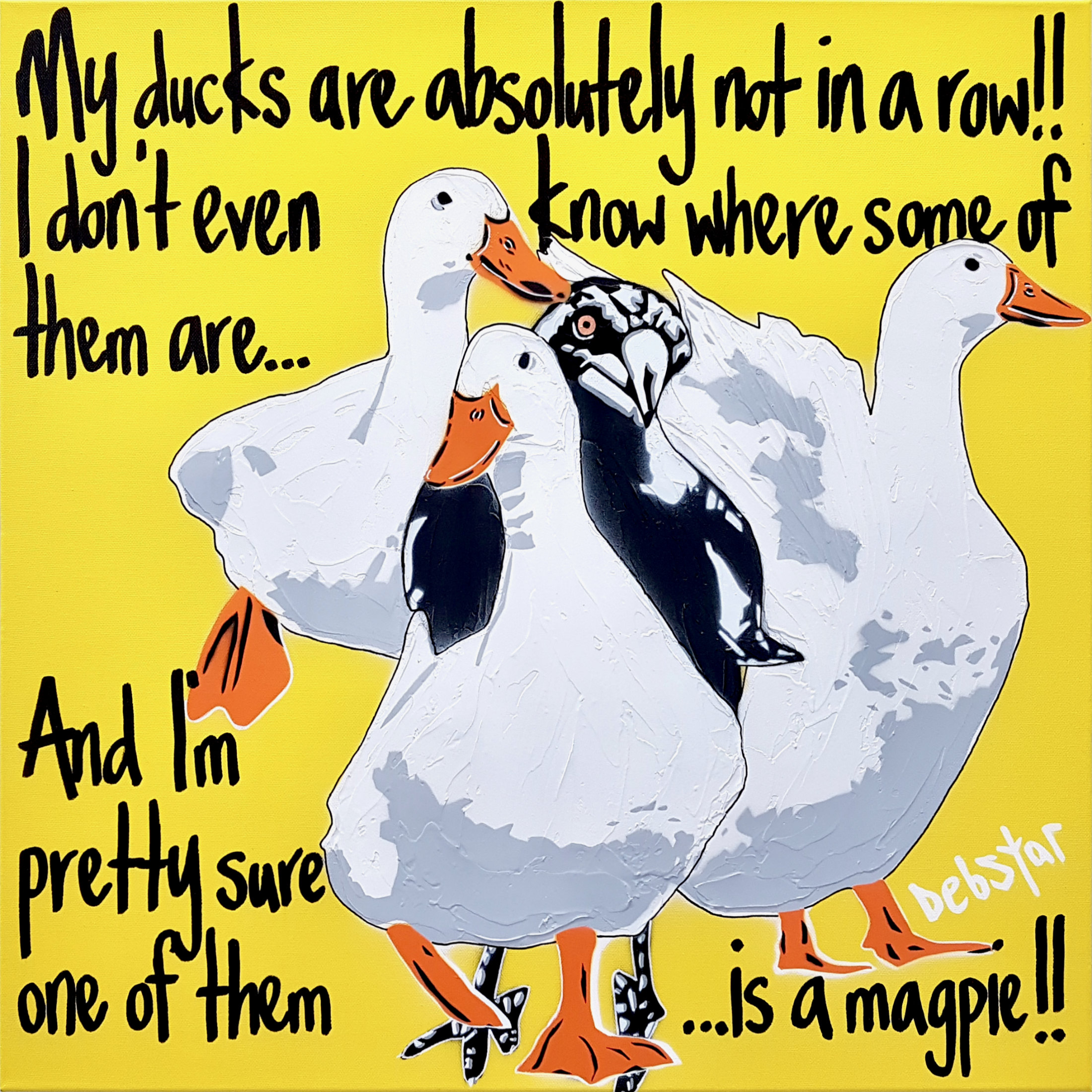 Yellow Ducks in a Row! 2 by Deborah Lang – Add some cute to your home with these ducks and cheeky magpie!