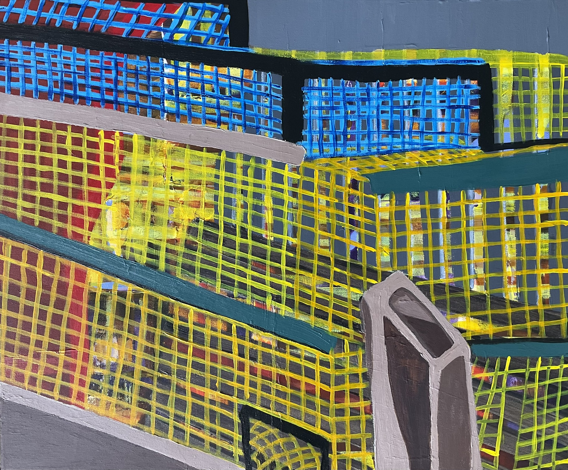 Painted loosely from a photo taken of lobster cages in Nova Scotia. Thinking about the grid and the life of fish farmers. This painting contains many layers.