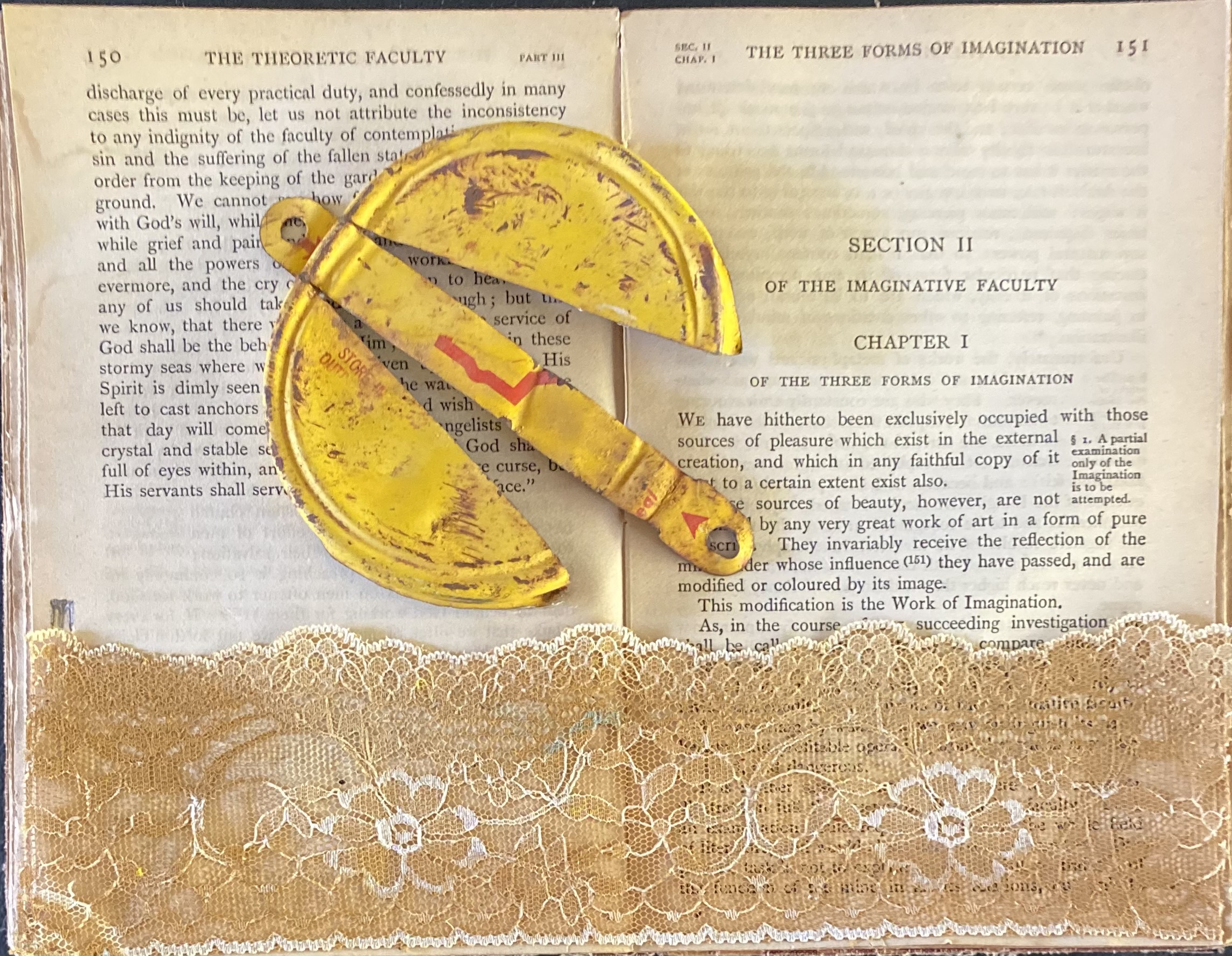 Yellow Moth by MANDY MCGUIRE is a small intimate assemblage of found objects that makes reference to the artist’s life. Reading by lamp-light in ‘the Bush’ inevitably attracted insects. The moment the artist chose the yellow lid she knew it was a moth that belonged with the lace landscape. Here, the open pages add meaning to the simple narrative.The chosen objects are honest and weather-beaten and each item was gathered from various locations from as far west as The Sturt Stoney desert. The artwork is framed to intentionally appear as a museum artefact.