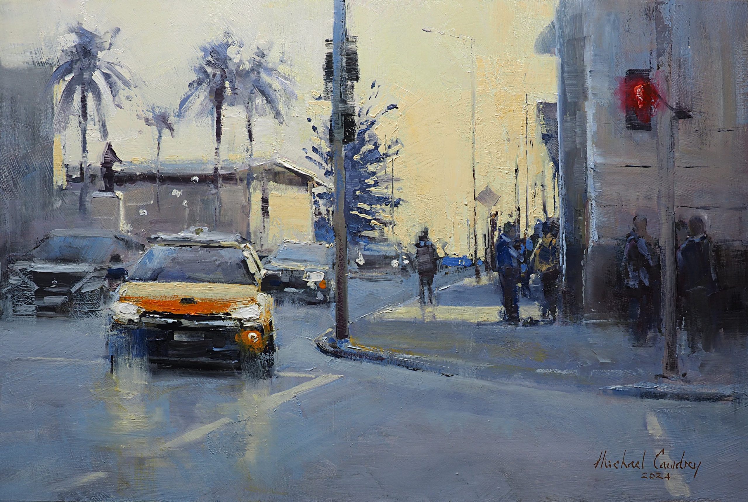 This original oil painting depicts the intersection of George and Elizabeth Streets, Brisbane, at day’s end, with the last trace of yellow sunlight in the sky.