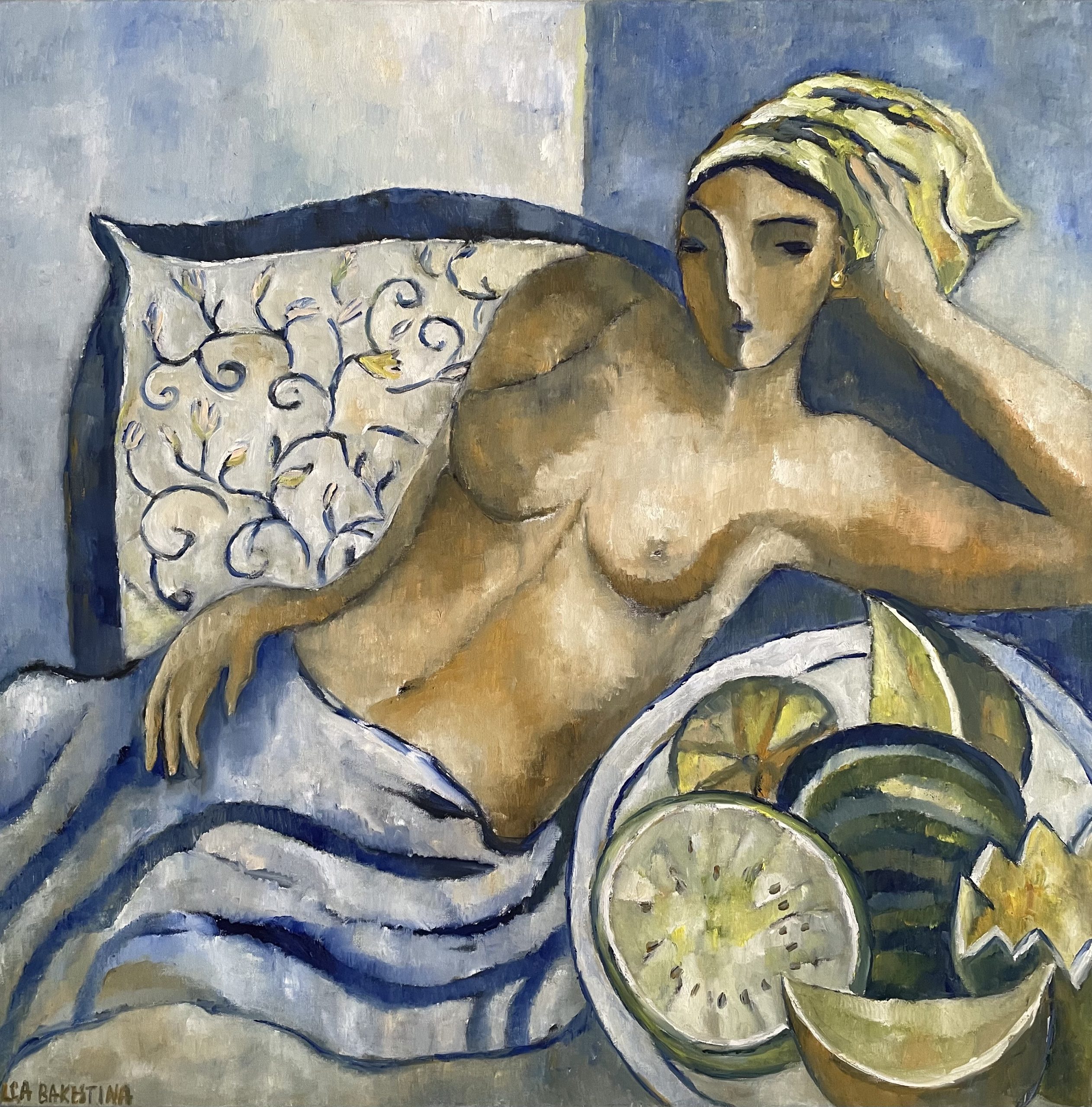 Yellow Turban is part of a series of works inspired by the memories of the Middle East where my family and I used to live for a few years. Artistically, the work is a study of relationships between shapes and colours. I used the limited pearly cold palette to achieve tranquility and overall harmony. Size: 90cm x 90cm x 2cm. Ready to hang. Edges painted black. Can be hung framed or unframed.
