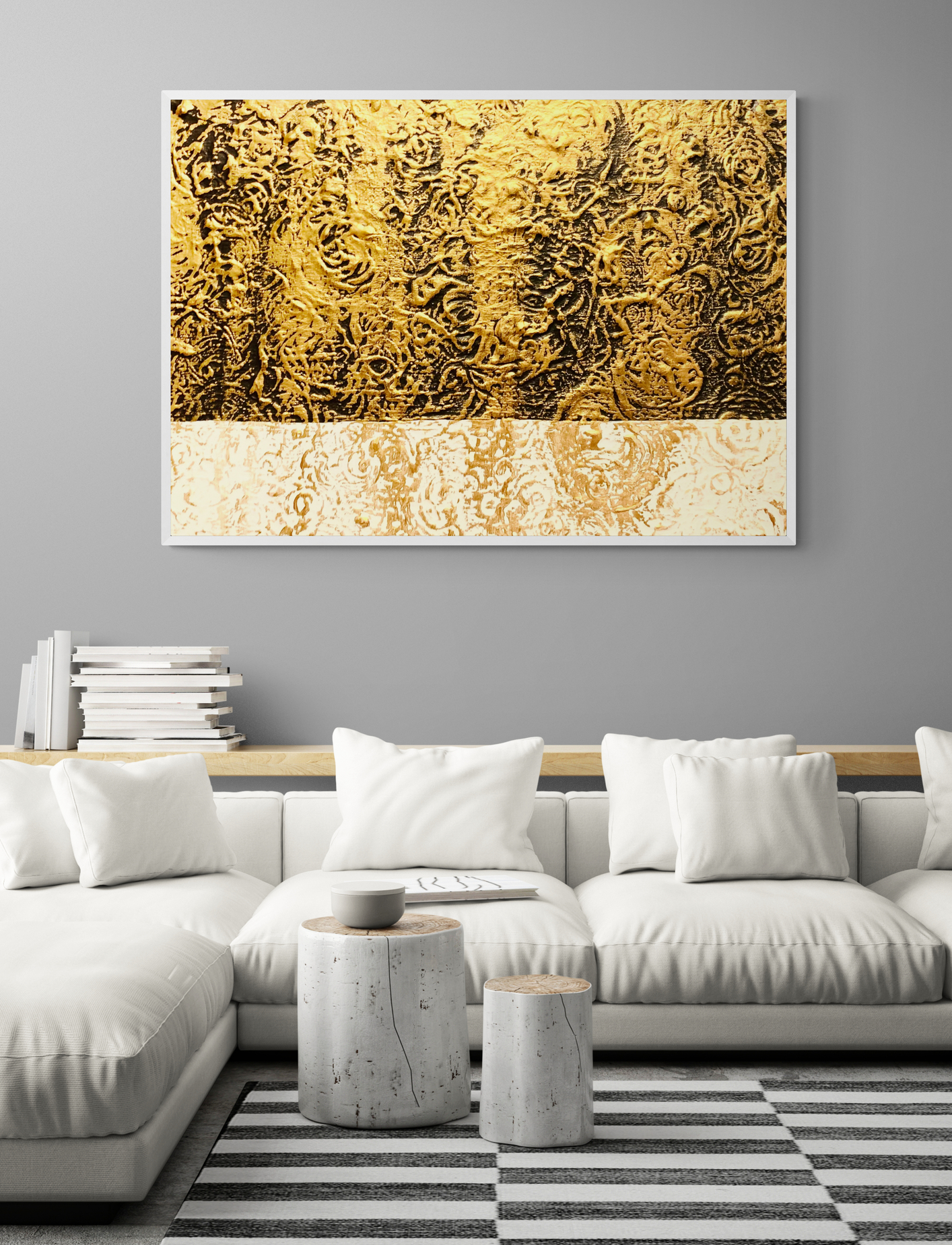 Heavily textured with over 300 sacred global healing inscriptions and metallic gold highlights. A pure love and light modern designer piece.