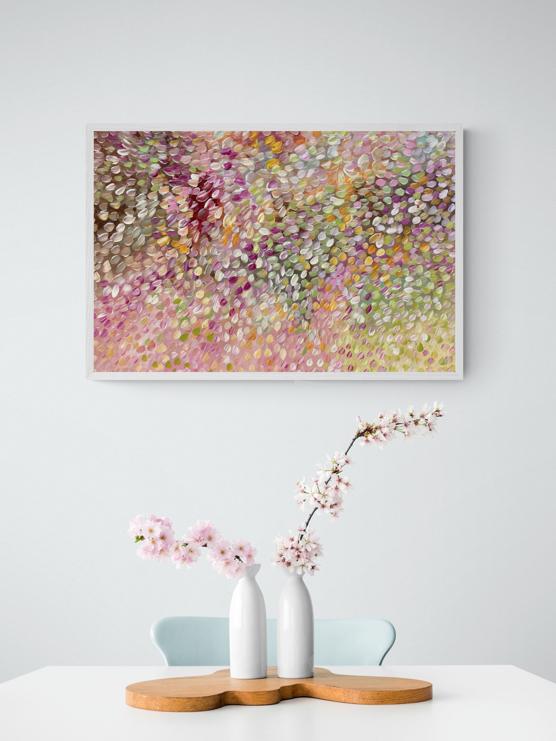 You are my Sunshine by Theo Papathomas a painting with soft colours of the petals flying in the wind creating this beautiful carpet of petals in the landscape with lots of layers of paint. Beautiful flickering petals dancing over the land shining like stars. Petals weeping onto the landscape creating this veil of petals covering the landscape in as of pastel colours . A composition of colours and rhythms of petals dancing like musical notes over the land . A very peaceful and tranquil painting with so much depth. The painting does not come with an external frame.The painting is signed and dated 2021 at the back and comes with a certificate of Authenticity.