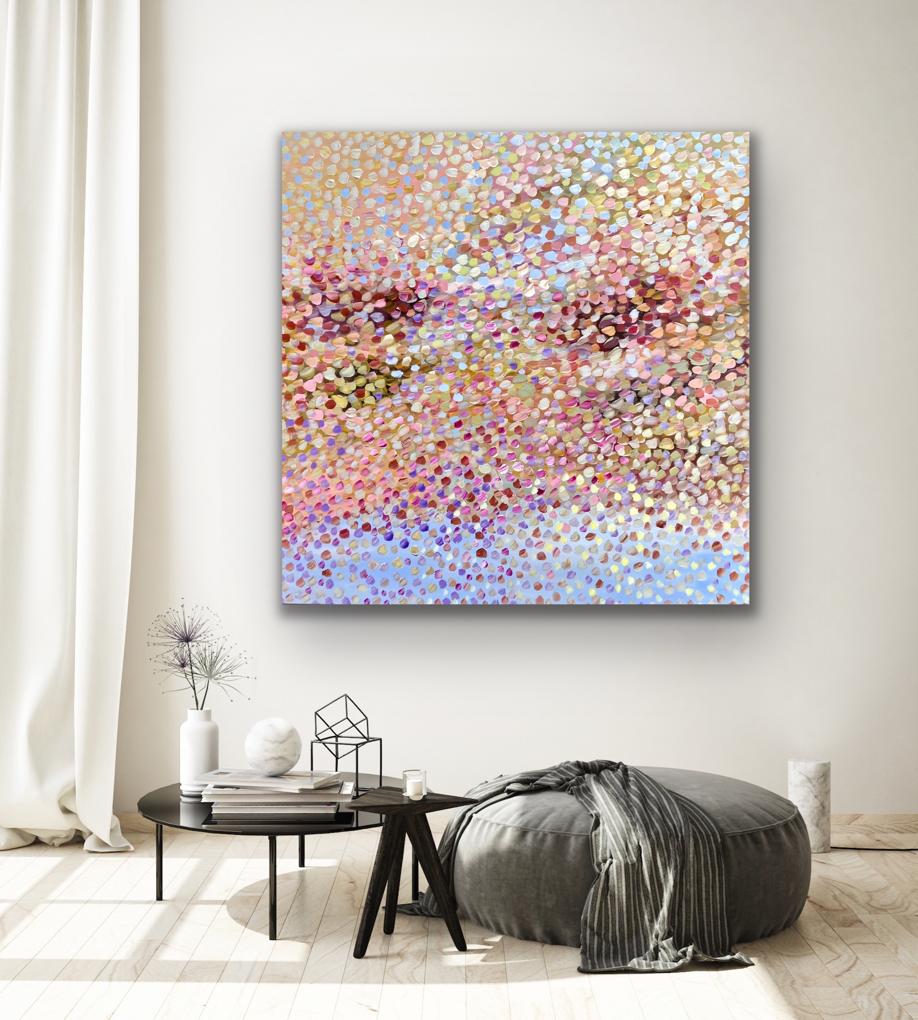 You are my World by Theo Papathomas  a painting with beautiful pastel colours of the petals flying in the wind creating fireworks in the sky. Like beautiful jewels shining like stars in the sky. Capturing the light of the sun falling on to the petals creating a beautiful bouquet of Petals . Petals weeping onto the landscape creating this beautiful veil of colours covering the whole sky . A composition of colours and rhythms of petals dancing in the sky like musical notes . A very peaceful and tranquil painting with so much depth . The painting does not come with an external frame.The painting is signed and dated 2021 at the back and comes with a certificate of Authenticity.