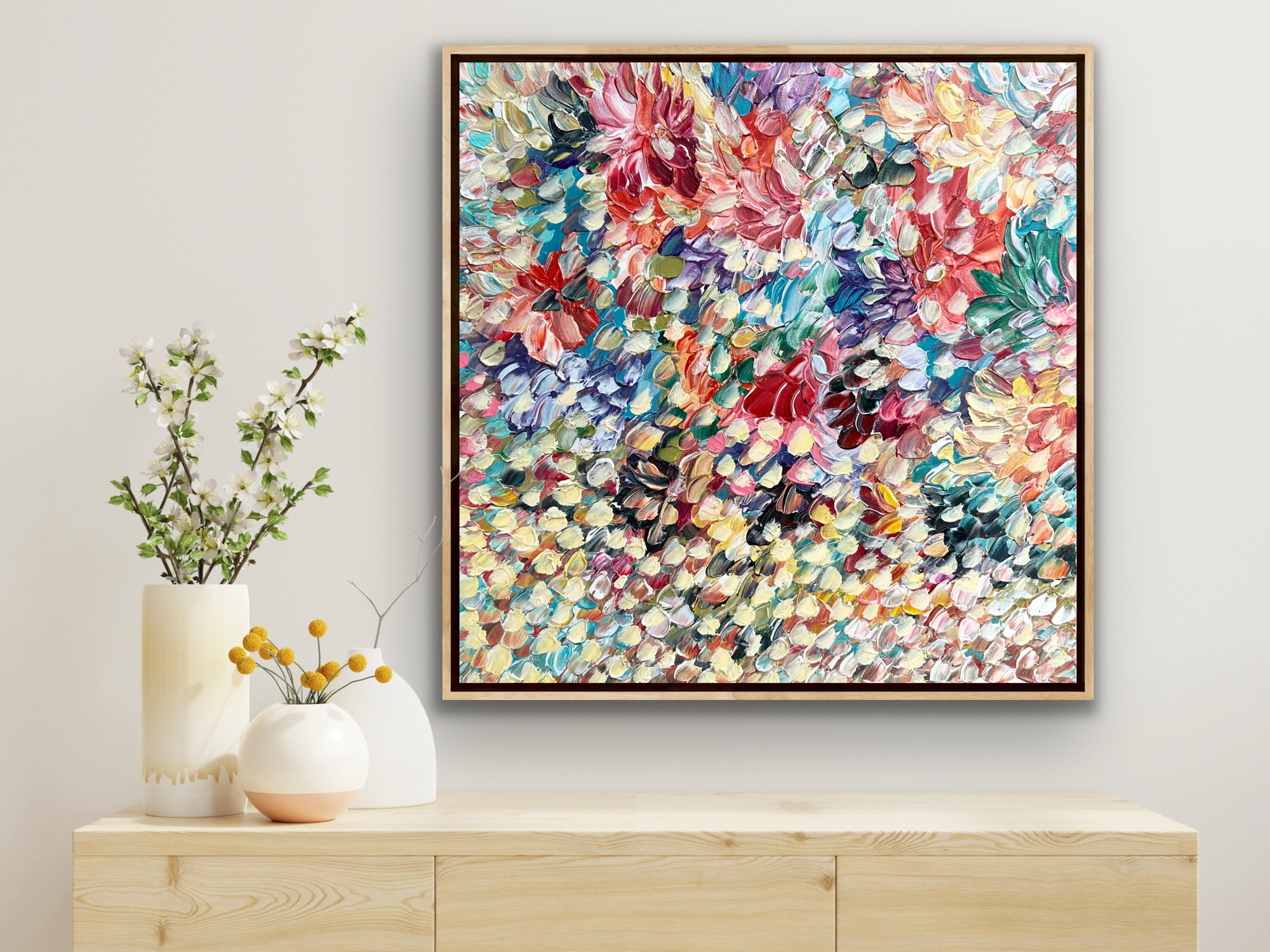 You Beauty 2 by Theo Papathomas a painting with lots of layers of beautiful warm and cool colours of petals weeping over the field. The landscape becomes a bouquet of petals dancing over the land. I tried to create this beautiful composition of playful colours of the landscape of flowers and petals making a beautiful field of memories . Capturing the beautiful colours of the petals, like musical notes dancing over the landscape, painted in acrylics with a pallet knife. Painted with a pallet knife makes the painting full of energy with lots of acrylic paint creating lots of texture. The painting comes with an external frame.The painting is signed and dated 2023 at the back and comes with a certificate of Authenticity.