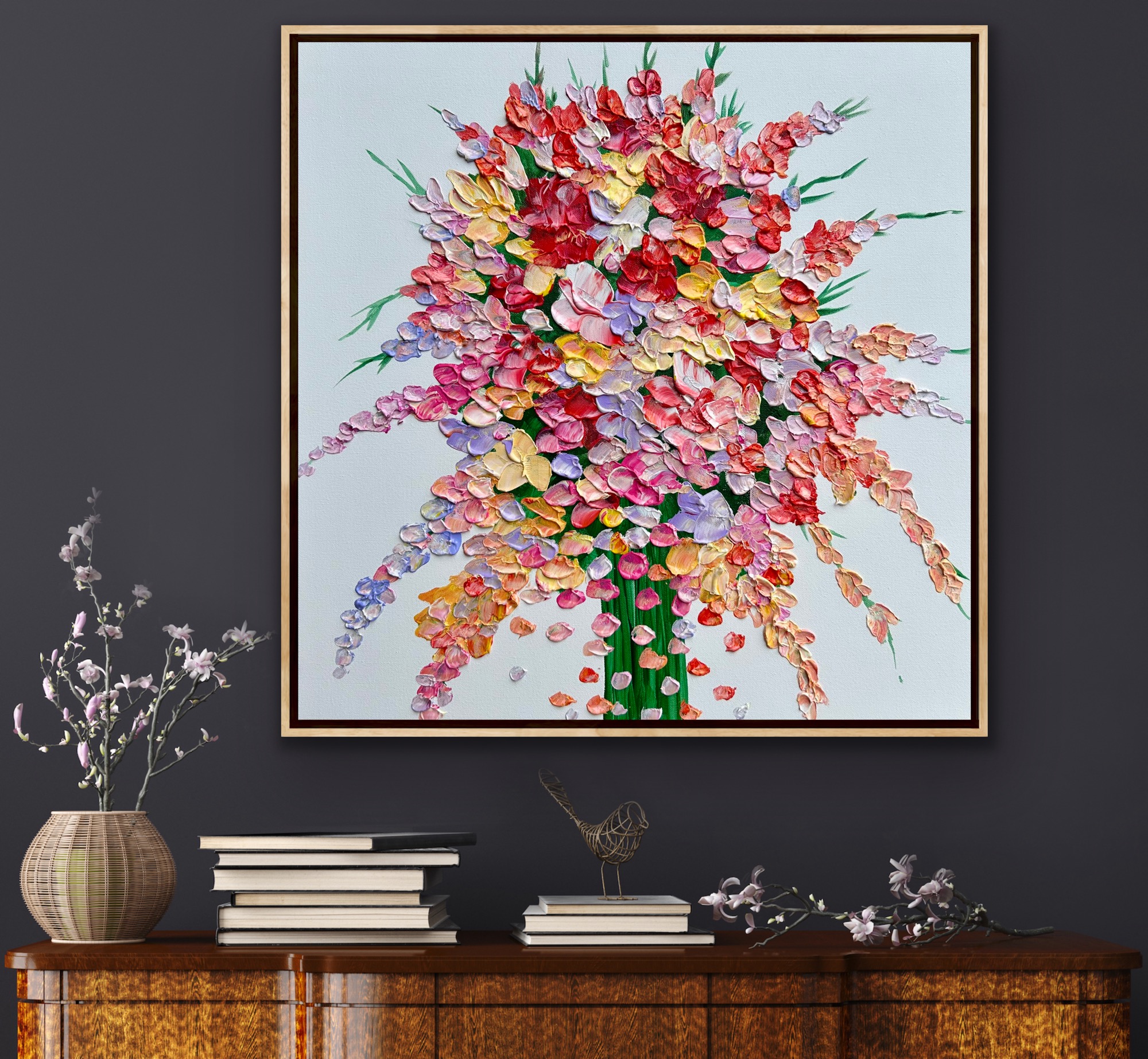 You colour my Dreams by Theo Papathomas is painted with a pallet knife to create so much texture. A beautiful bouquet of flowers and petals painted with lots of expression and freedom to create movement and rhythms . A very peaceful and tranquil painting with so much depth . The painting does not come with an external frame.The painting is signed and dated at the back and comes with a certificate of Authenticity.