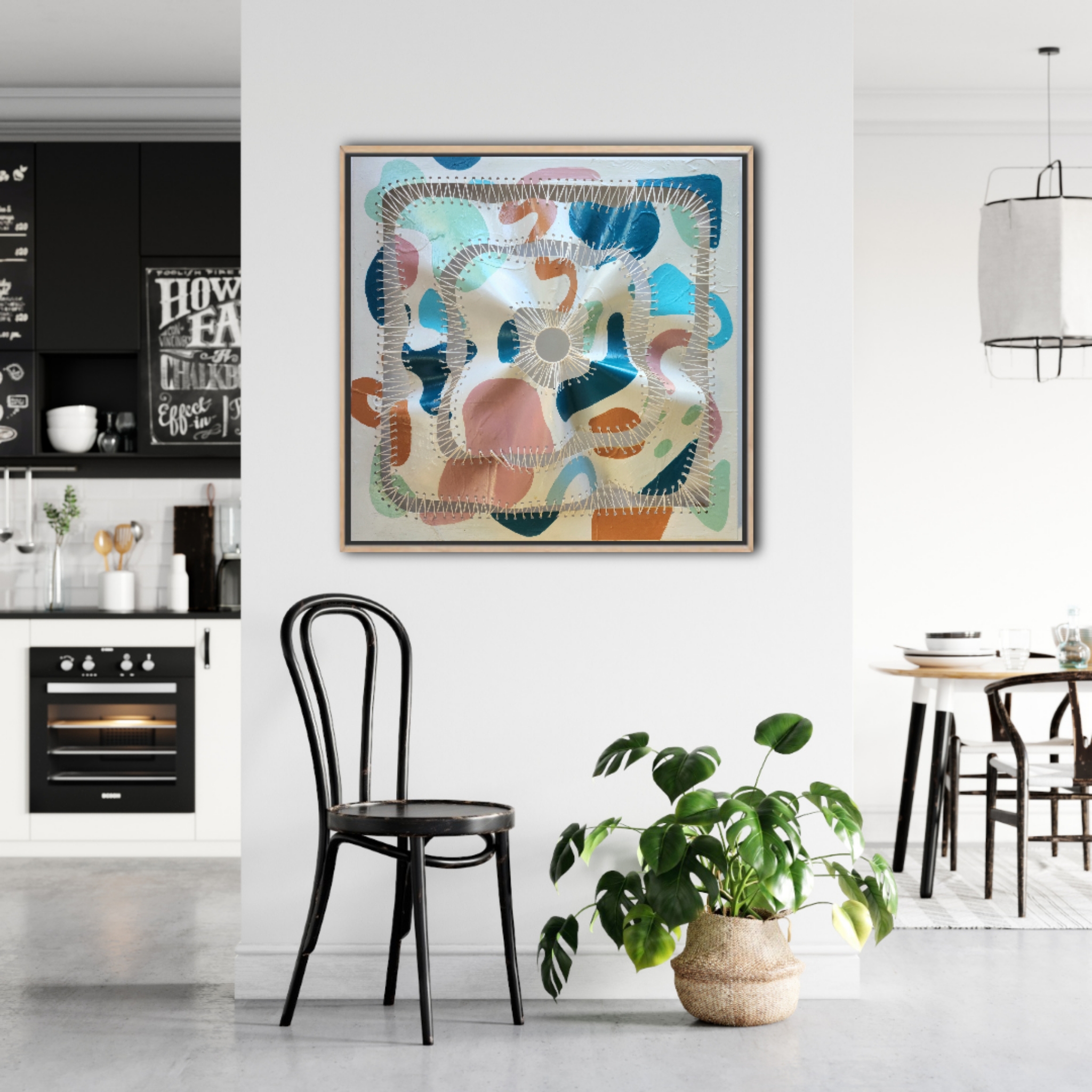 the canvas is transformed into dynamic, organic shapes that extend beyond a flat surface. This tension-based method results in textured, sculptural forms that emphasize resilience and reinvention, blending traditional art practices with innovative fabric manipulation. embodies the transformation of destruction into art, through innovative experimentation and boundary-pushing. This process highlights the beauty of rebuilding, celebrating resilience and the elegance of reconstructed imperfection.”