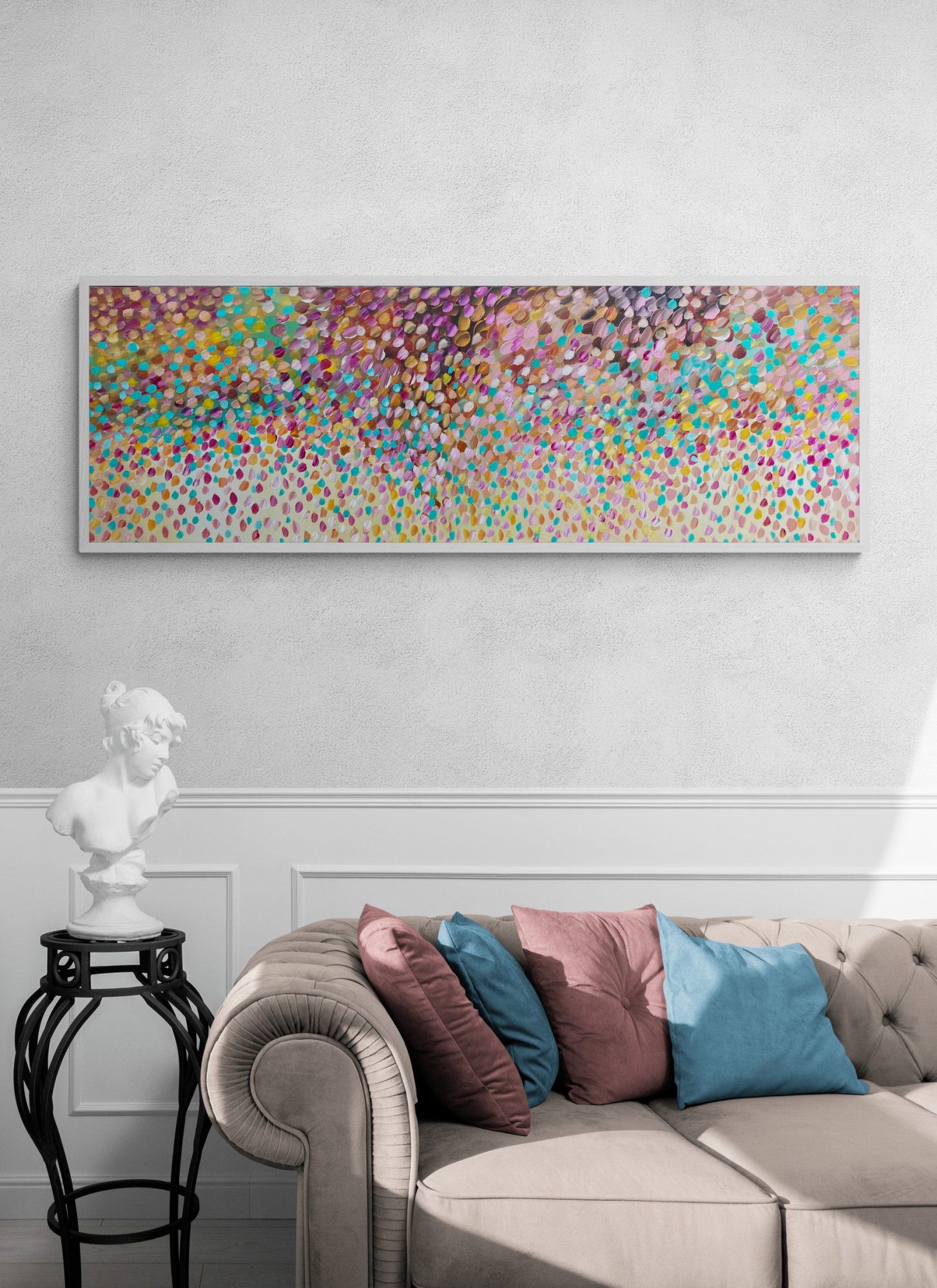 You light up my World by Theo Papathomas a painting with beautiful warm and cool colours of the trees and petals flying in the wind falling over landscape. Petals weeping onto the landscape creating this beautiful veil of colours covering the whole landscape . A composition of rich colours and rhythms of petals dancing over the landscape like musical notes. A very peaceful and tranquil painting with so much depth . This painting is painted on canvas and does not come with an external frame .The painting is signed and dated 2021 at the back and comes with a certificate of authenticity.