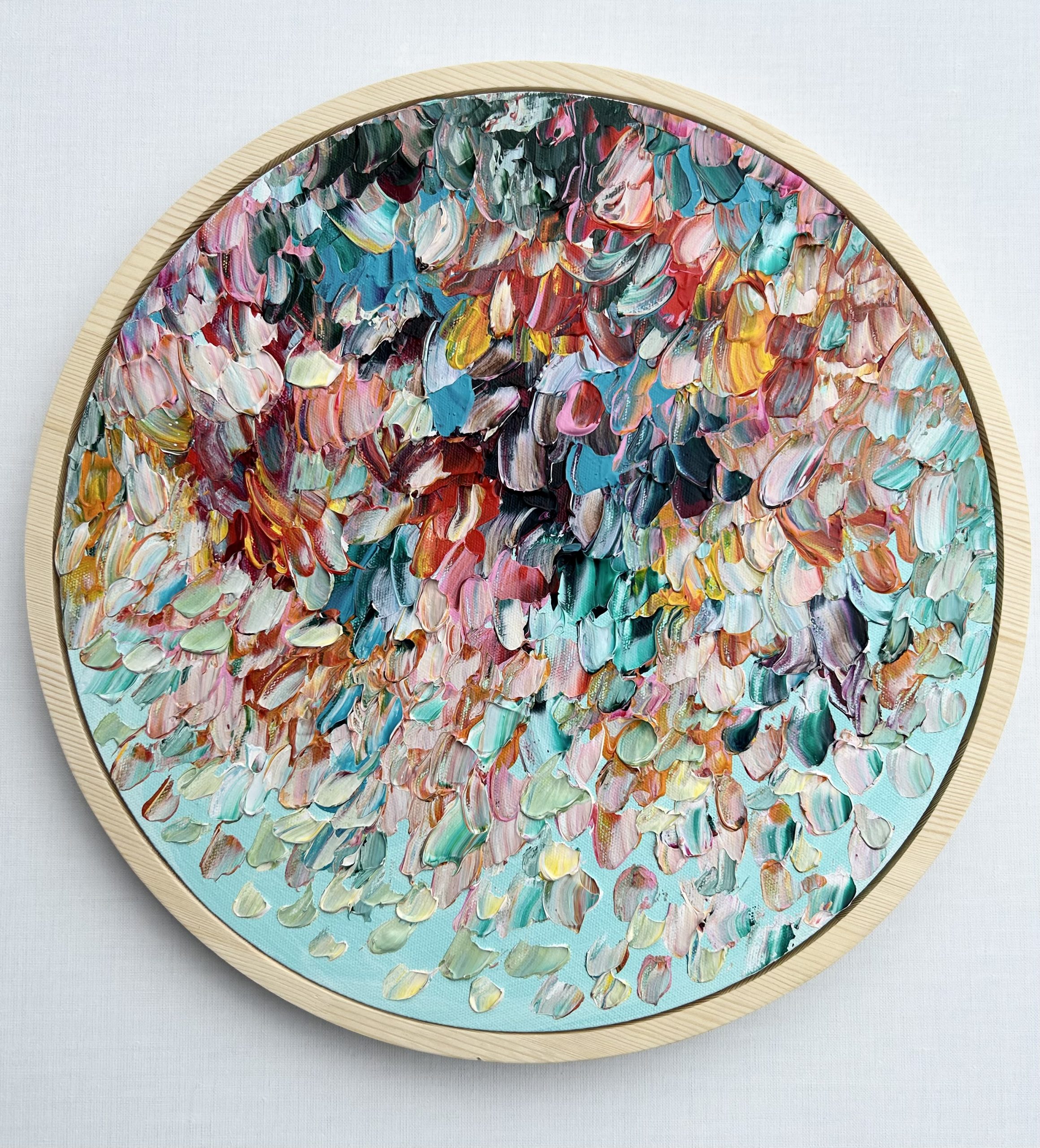 You love me, You love me not, You love me by Theo Papathomas is a painting with lots of layers of beautiful warm and cool colours of petals covering the field. The landscape becomes a bouquet of petals dancing over the land. I tried to create this beautiful composition of soft colours of the landscape of flowers and petals making a beautiful field of memories . Capturing the beautiful colours of the petals, like musical notes dancing over the landscape, painted in acrylics with a pallet knife. The field comes to life with the sounds of the petals creating movement and rhythms. Painted with a pallet knife makes the painting full of energy with lots of acrylic paint creating so much texture. The painting comes with an external frame.The painting is signed and dated 2023 at the back and comes with a certificate of Authenticity.