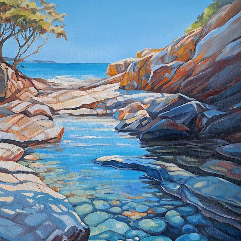 In this piece I have applied a great amount of texture in various forms, from modelling paste to tiny rocks to accentuate the texture. Gold paint is also used to highlight texture, colour and contrast.