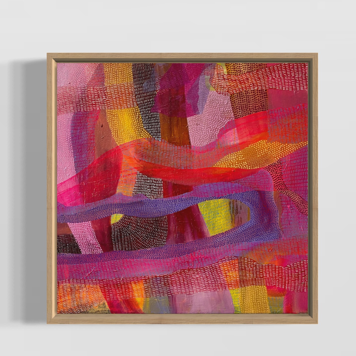 This was created by building layers of medium; first acrylic glazes then ink washes and acrylic paint. There are also layers of intricate pattern and mark making which is done to both contrast and compliment the paint layers. There is an additional layer of collage in the form of hand dyed paper. This adds a shadowy impression across the work and is in a lilac shade. Due to this layering technique, this wok has an incredible amount of depth, with various areas of the under painting visible. This work is bold and impactful but the subdued colour palette also makes it very livable. There are vibrant areas of magenta, lilac and coral and contrasting ares of maroon, plum and deep violet. There are also warm areas of ochre and white. This painting would work well in as part of a ‘galley wall’ display or a as a single painting in an area such as above a bedside table. They also sit well as decorative objects on bookshelves or mantles.