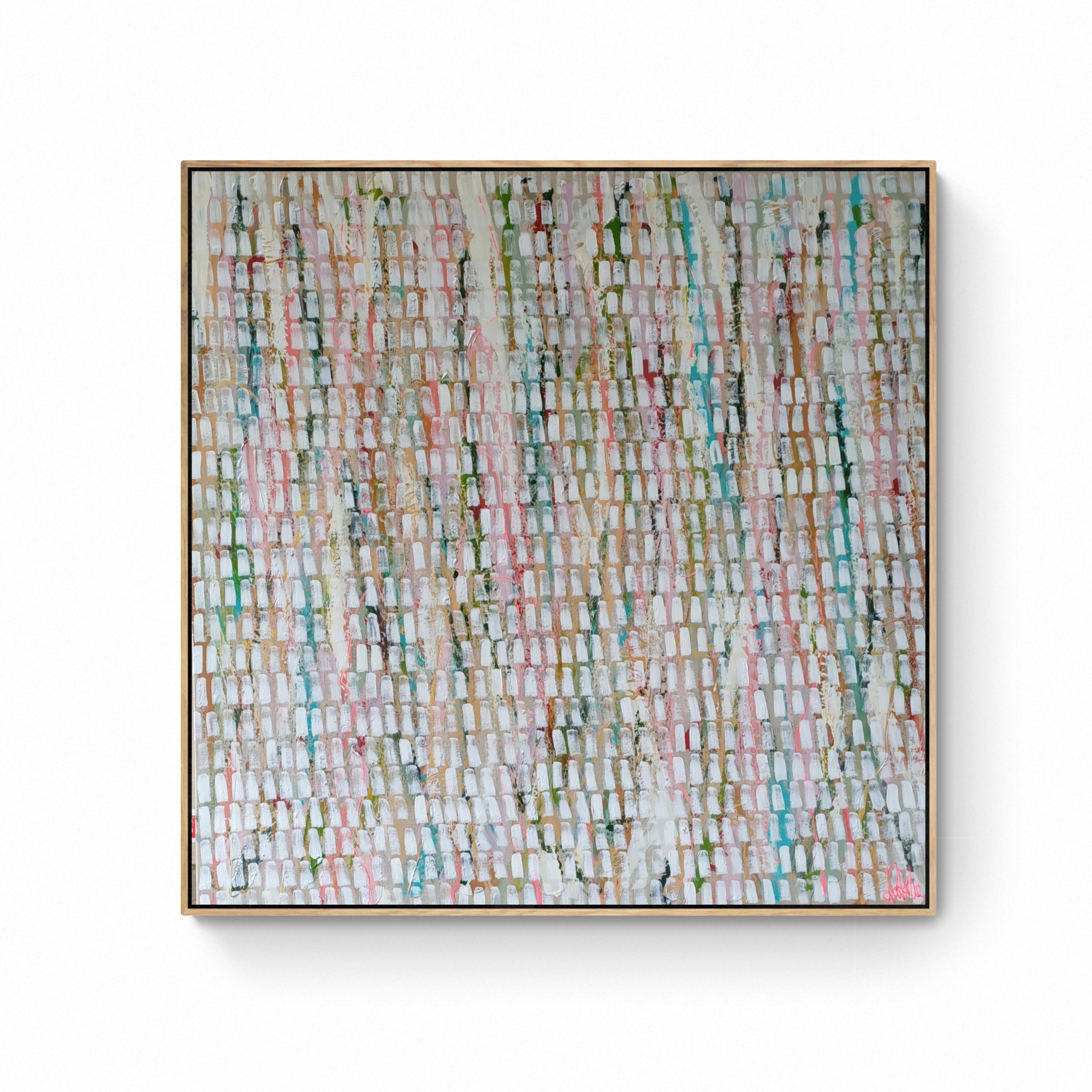 Painted on Belgium linen and built up in layers. Warm romantic colour palette then overlayed with Natalie’s signature white lines. They represent spirit, light, optimism.