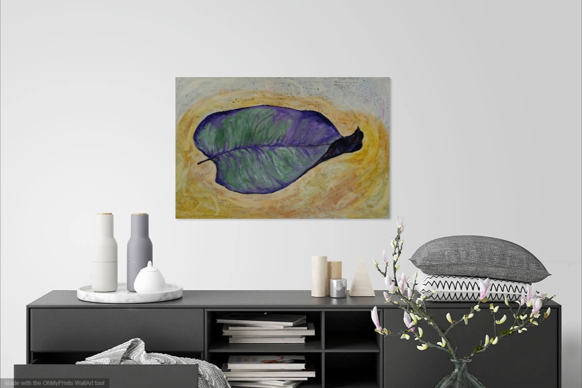 Your Words Fall Like Leaves by Olga Megele – Words Fall like Leaves is a little autobiographical. Words are important and they have the power to delight, to wound and to inspire. The words in this piece are the inscribing from a year in the life of my love. The crossing out, the notations and the remembering, the past that intrudes on our present. The leaves come from the trees of my life, the closeness that I feel to nature, the pull of a place. Here the two collide in the push and pull of life. His words, my words, our desires. The colours used are mostly transparent which really makes the colours become very vibrant. The surface has been covered with a protective layer of acrylic sealer which has enhanced the beautiful, rich colour.