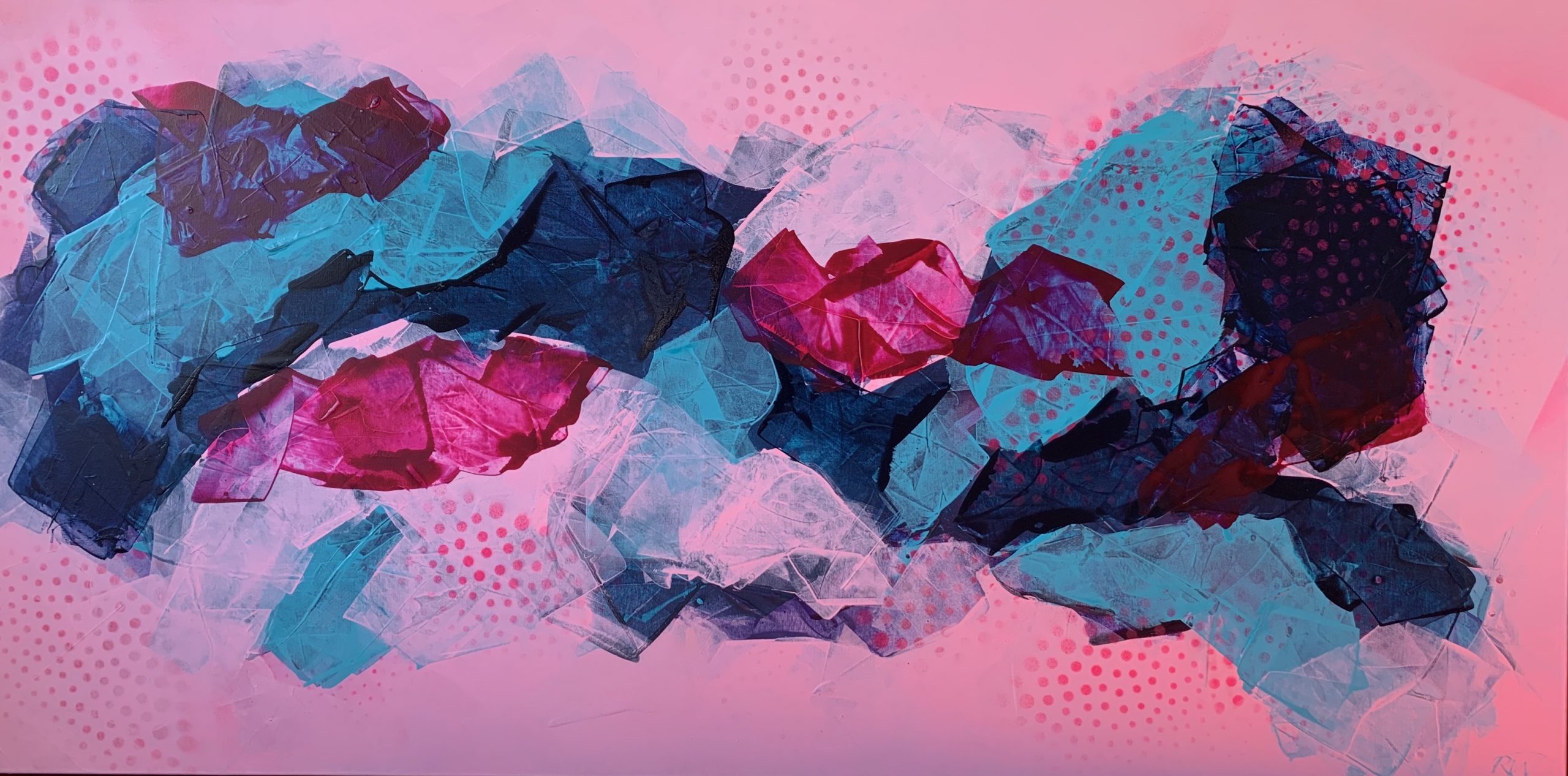 This is painting where layers have been built up with the use of a Catalyst Wedge. A teal hue has been juxtaposed with pale pink , magenta and navy, to create a sense of contrast. The use of the catalyst wedge has resulted in a subtle surface texture generating a sense of spontaneous movement. In amongst layers of painting, dot stencils have been spray painted on to add a little more visual variety and subtle pattern. I have titled this piece ‘You’re Making me Blush’ because of the dominant use of pink.
