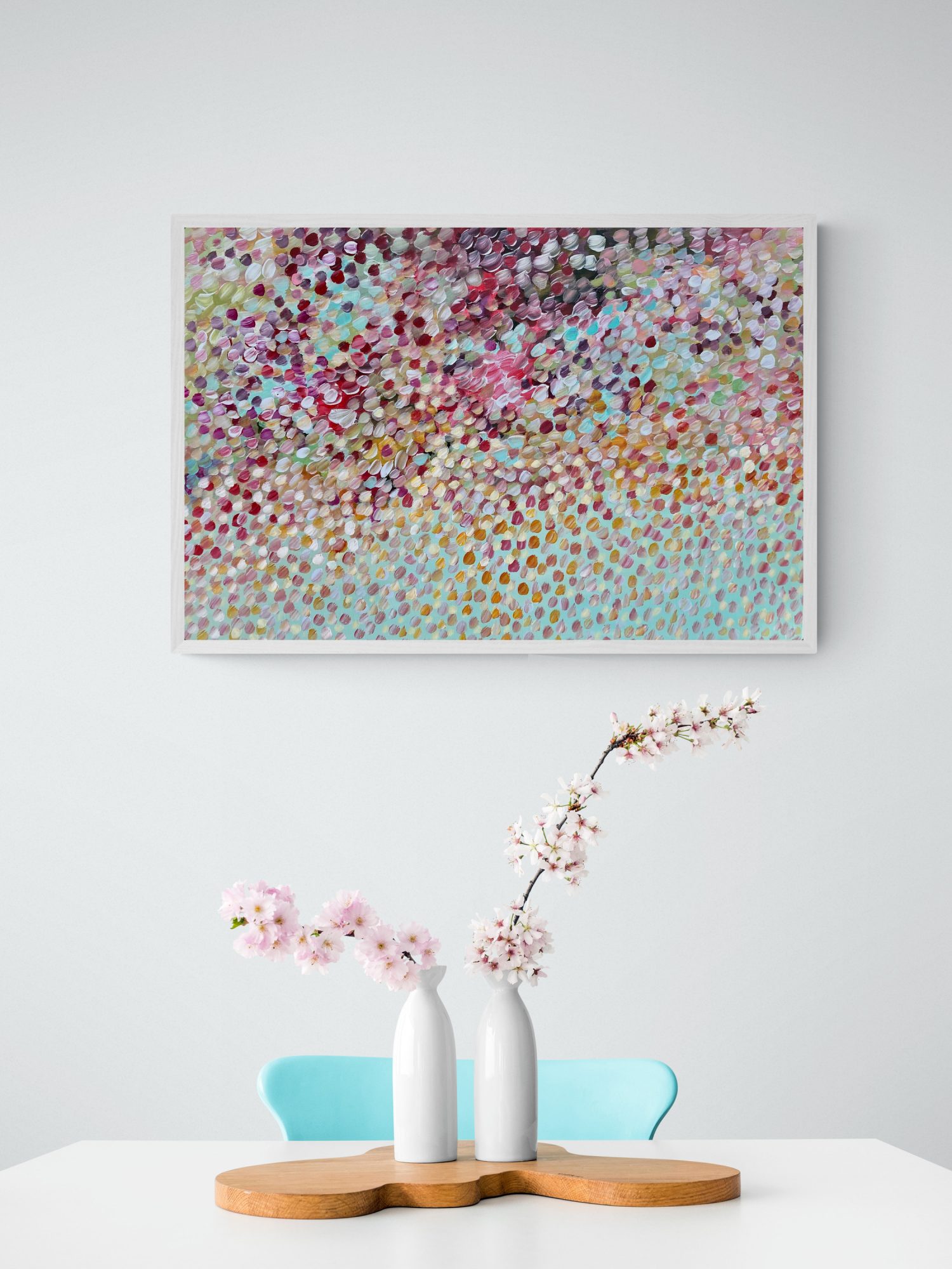 Yours Always by Theo Papathomas a painting with soft colours of the petals flying in the wind creating this beautiful carpet of petals in the landscape with lots of layers of paint. Beautiful flickering petals dancing over the land shining like stars. Petals weeping onto the landscape creating this veil of petals covering the landscape in soft pastel colours . A composition of colours and rhythms of petals dancing like musical notes over the land . A very peaceful and tranquil painting with so much depth. The painting does not come with an external frame.The painting is signed and dated 2021 at the back and comes with a certificate of Authenticity.