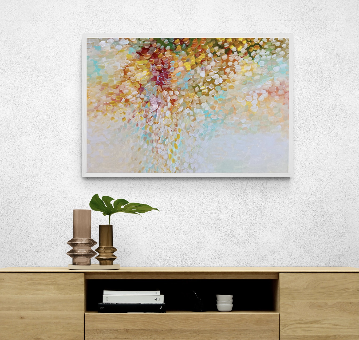 Yours Always by Theo Papathomas a painting with warm colours of the petals flying in the wind creating this beautiful carpet of petals in the landscape with lots of layers of paint. Beautiful flickering petals dancing over the land shining shining like stars. Petals weeping onto the landscape creating this veil of petals covering the landscape . A composition of autumn colours and rhythms of petals dancing like musical notes over the land . A very peaceful and tranquil painting with so much depth. The painting does not come with an external frame.The painting is signed and dated 2021 at the back and comes with a certificate of Authenticity.