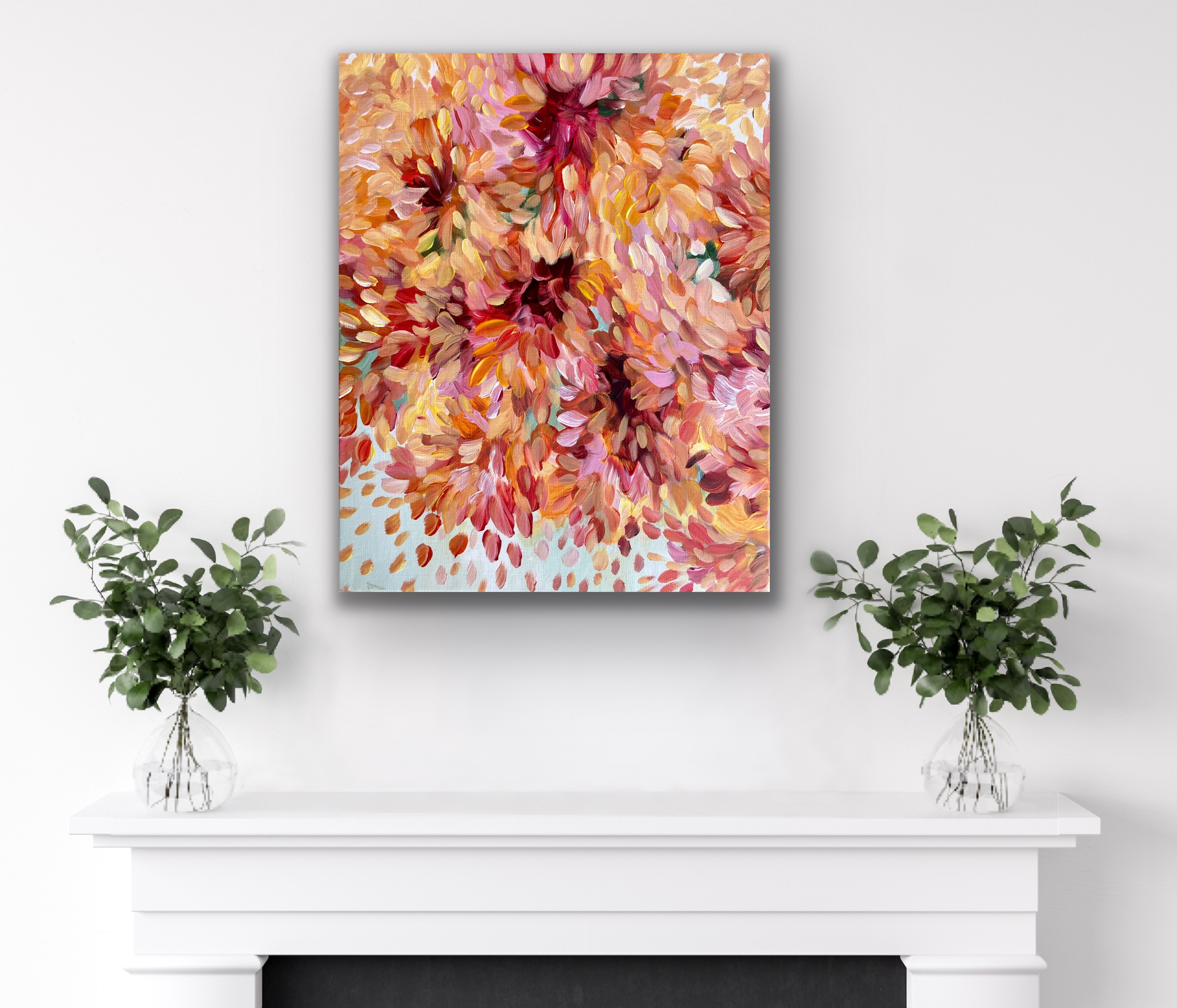 Yours Faithfully by Theo Papathomas a painting with beautiful colours of the petals flying in the wind creating fireworks in the sky. Like beautiful jewels shining like stars in the sky. Capturing the light of the sun falling on to the petals creating a beautiful bouquet of Petals . Petals weeping onto the landscape creating this beautiful veil of colours covering the whole sky . A composition of colours and rhythms of petals dancing in the sky like musical notes . A very peaceful and tranquil painting with so much depth . The painting does not come with an external frame.The painting is signed and dated 2021 at the back and comes with a certificate of Authenticity.