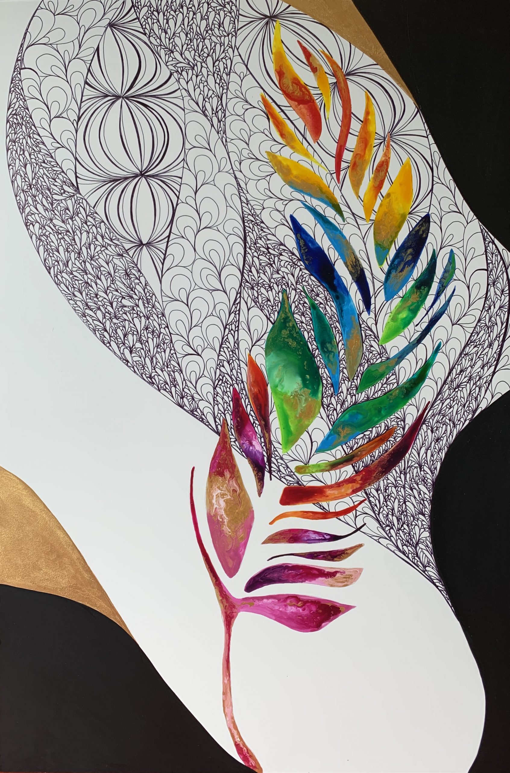 Zen Feather by Rebecca Warr – This artwork was an experimental piece where my aim was to create a vibrant image of a feather using acrylic inks. The ink creates a marbled effect and the colour has been mixed to graduate from warm pinks and purple, to green and blue, then finally to yellow and orange. Gold ink has been added amongst the colours to create a sense of harmony and to draw the viewer’s eye vertically in the direction of the feather. The feather is contrasted with areas blocked out in black and gold and a zentangle pattern has been added in the background. This artwork juxtaposes simple forms with flowing colour against intricate pattern.