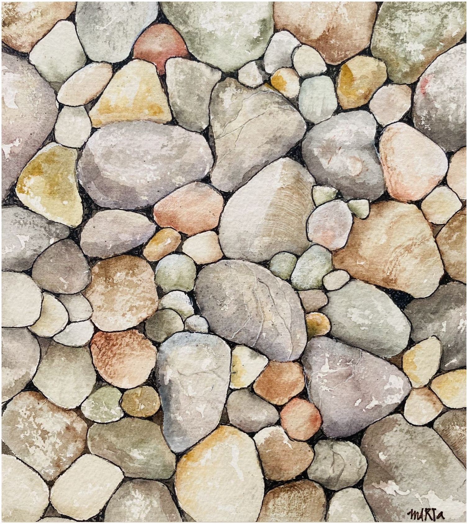 For this pebble painting I was experimenting with water colours on 300 gsm. Working on the texture and shape of these small rocks is meditation in itself. The 30cm x 30cm painting is mounted on a white laminate board and framed with a 43cm x 43cm modern white frame. Two d-rings are attached to the back and it is ready for hanging.