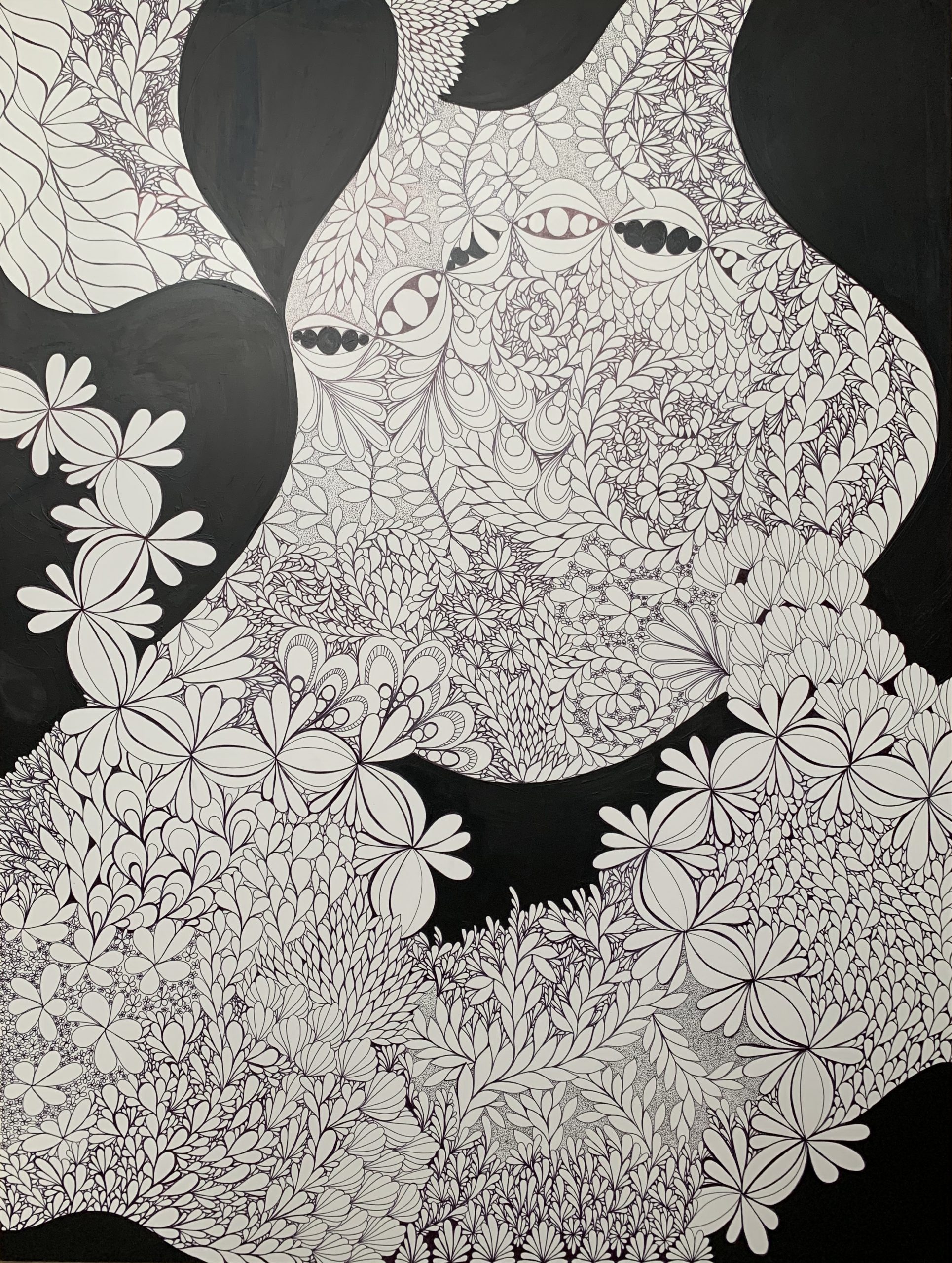 Zentopia Garden by Rebecca Warr – Producing zentangle work appeals to me because it helps me escape and feel relaxed and at ease. This is what I hope the viewer takes away from observing this large scale artwork. It has been a time consuming process to complete but the intricacy that results makes it very satisfying and well worth the effort. I am particularly intrigued with the addition of the black areas that lead the viewers eye across the work further increasing its aesthetic appeal.