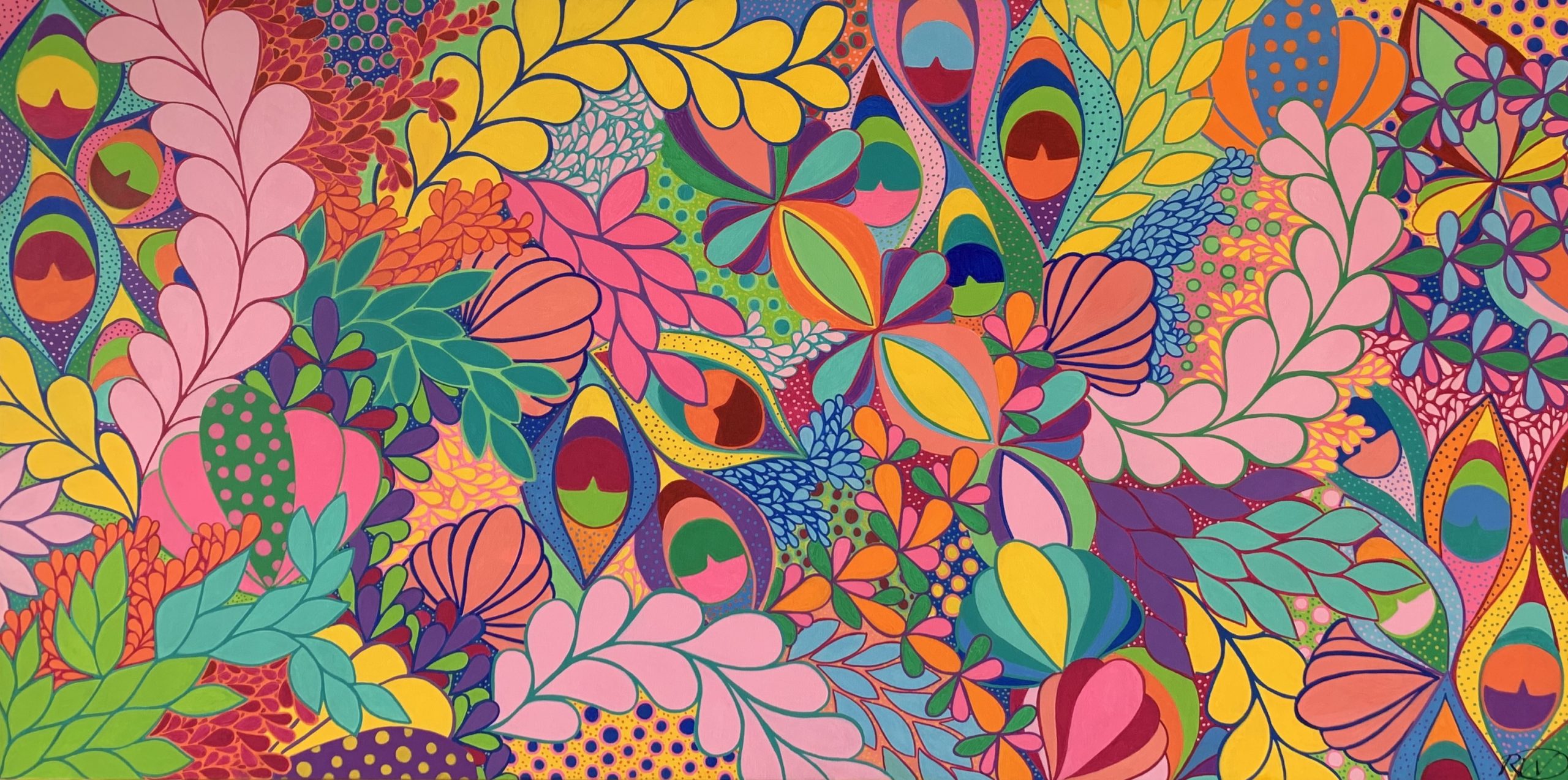 Zentopia by Rebecca Warr – This artwork is a reflection of my interest in pattern making and vibrant colour schemes. Producing this large scale canvas was a time consuming exercise but I found the process quite meditative. The use of a vivid palette juxtaposed with meandering patterns and shapes inspired by nature results in an eye catching artwork sure to brighten up any home.