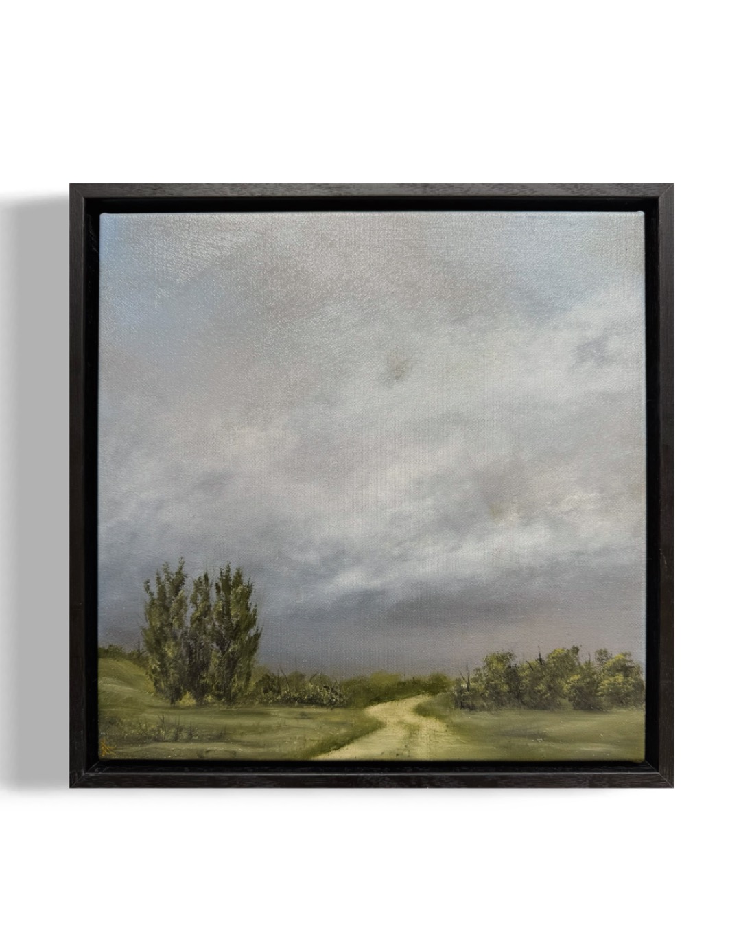 Ready to hang, original oil painting on stretched canvas with Oak floating frame.