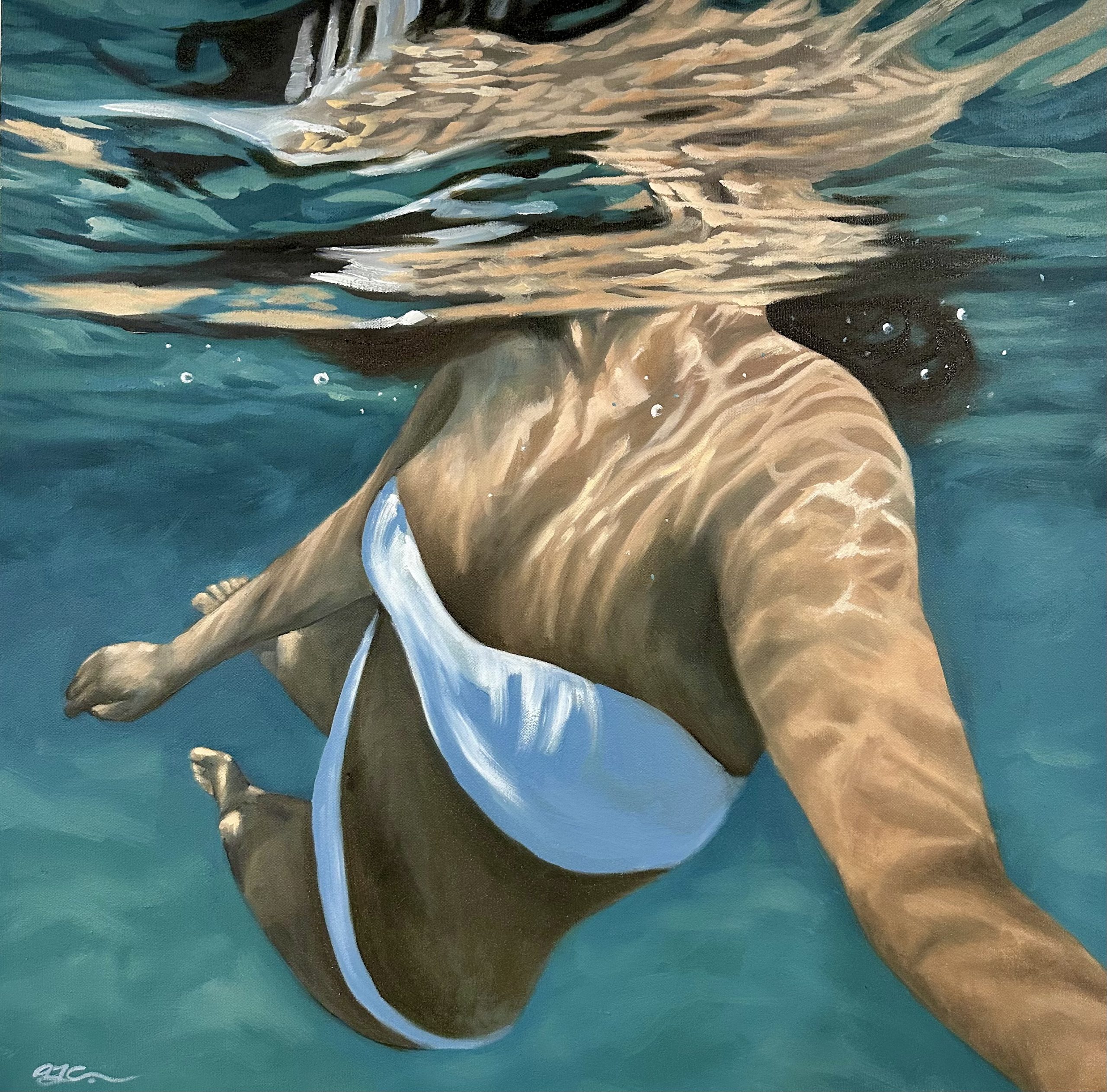 Zero Gravity No 2Â by Amanda Cameron – is one of a new series called ‘Salt Water’. While still exploring the interaction and connection between water, light and form, this series also analyses the sense of disquiet when swimming in deep ocean water. At the same time, the main focus is the quest for refuge, quietness and escapism. These paintings juxtapose the lone swimmer and a few minutes of introspection when alone in deep water against the fear of the unknown. The constant struggle between hyper-realism and having a painterly quality to my work is a conflict I always try to balance; therefore, thick paint and evident brush strokes are present when viewed up close. This piece is painted in professional oil paints on a museum-quality canvas and finished with edges painted, varnished for protection and framed in a quality oak floating box frame. It comes ready to hang and includes a certificate of authenticity.