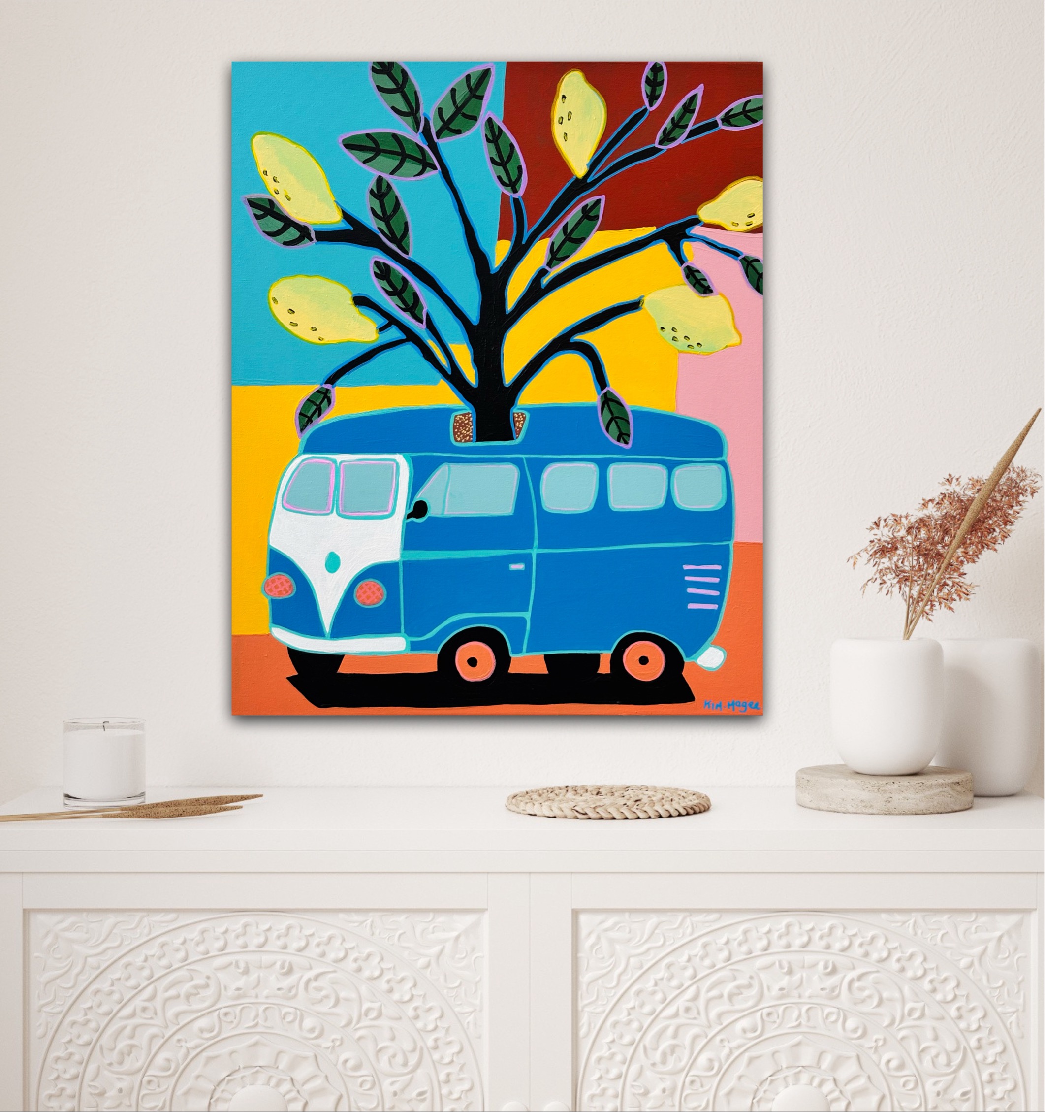A bright blue combi van bursts into life with a lemon tree growing from the top, set against a patchwork background of joyful colour.