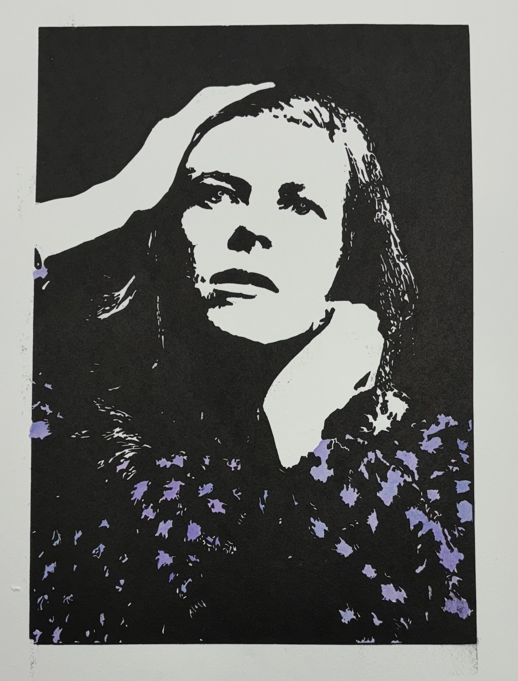 Ziggy Stardust – Music Legend by Sara Valentino is a varied edition series with a total of 16 linocut prints. This work is a celebration of a music legend as Ziggy Stardust (among many other ‘personas’) and the release of his album ‘Hunky Dory.’ A simple black and white print, the buyer is able to choose to have this print with or without colour highlights, which would be a subtle watercolour hue (as in the image). This print has been created using oil based inks and archival paper.