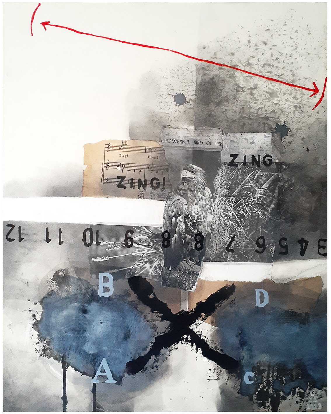 “Zing Zing” by G Kustom Kuhl – is an original mixed media painting by Melbourne abstract artist G Kustom Kuhl. The work explores the emotion of moving past the old life towards an exciting new phase of life that brings in that nervous feeling of anticipation and the feeling of being free. This original work has been made up using pencils, inks, oil sticks, vintage images, vintage music papers, hand made printing forms, paint and stencils all on Saunders Waterford artist 325gsm paper that has been adhered to board. The finish has been created using a polyurethane clear coat.