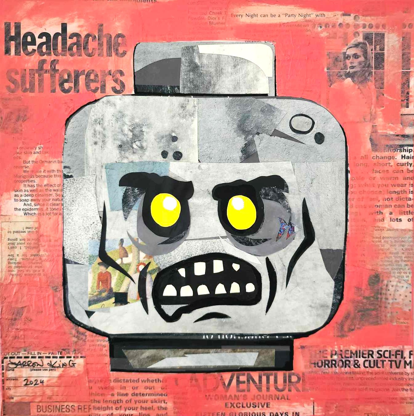The collaged paper elements have been taken from vintage magazines, books and comics. The Lego zombie head and background were created entirely from paper, then I added a salmon pink paint wash over the background, to make the head pop.